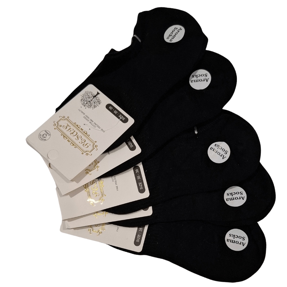 Czarne stopki damskie bawełniane to uniwersalny model do sneakersów i lekkiego obuwia sportowego. Skarpetki wykonane z 95% wysokiej jakości bawełny zapewniają miękkość i oddychalność przez cały dzień. Dodatek 5% elastanu odpowiada za elastyczne dopasowanie do stopy. Skarpetki posiadają oznaczenie Aroma Socks, podkreślające ich świeży i komfortowy charakter użytkowy.