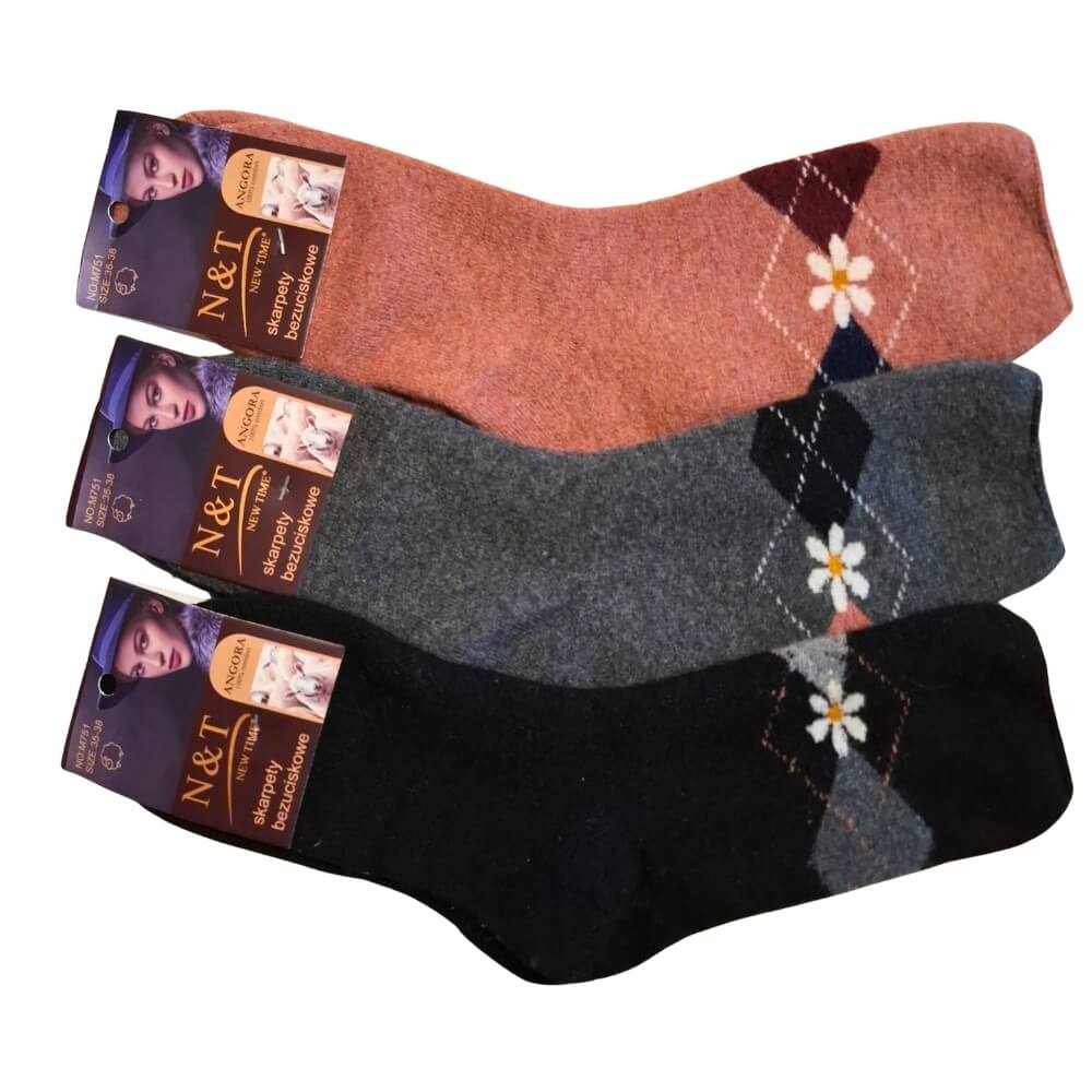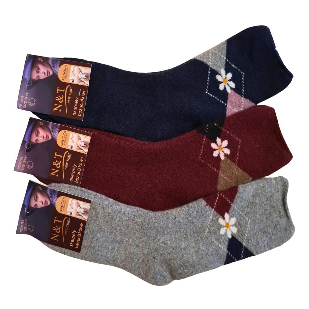 Damskie skarpety z angory bezuciskowe z kwiatkiem 3-pak ciepłe miękkie