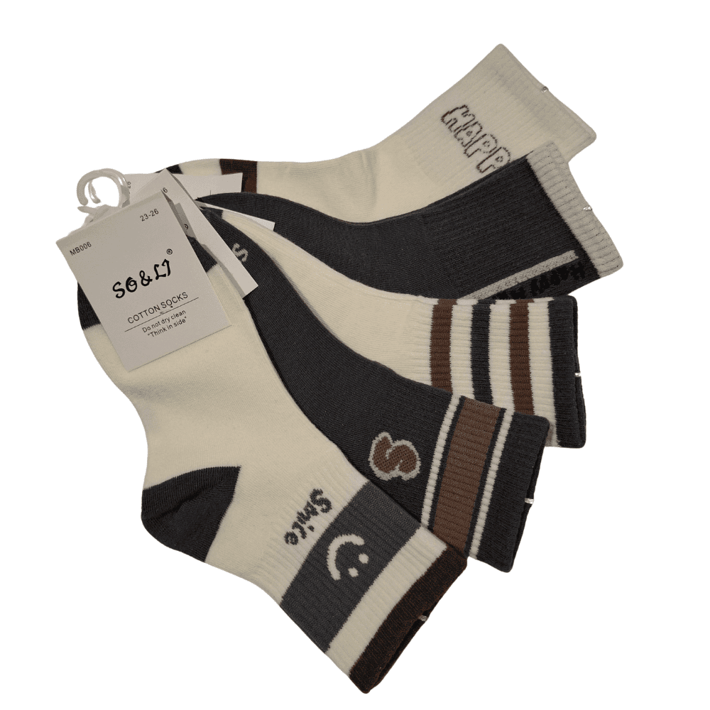 Zestaw 5 par chłopięcych skarpetek zawiera mix wzorów oraz kolorów, utrzymanych w odcieniach beżu, brązu, szarości i grafitu. Produkt dostępny jest w rozmiarach 23–26 oraz 27–30.