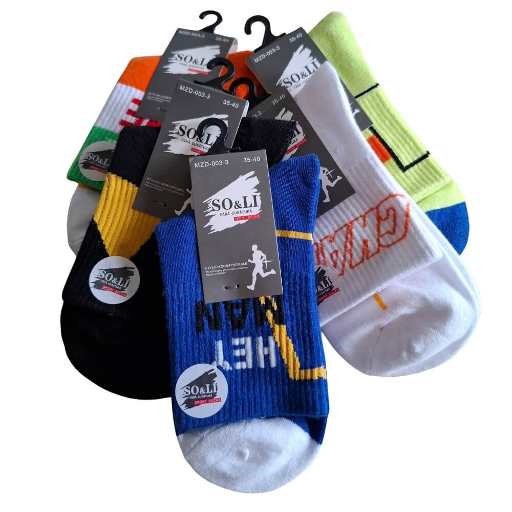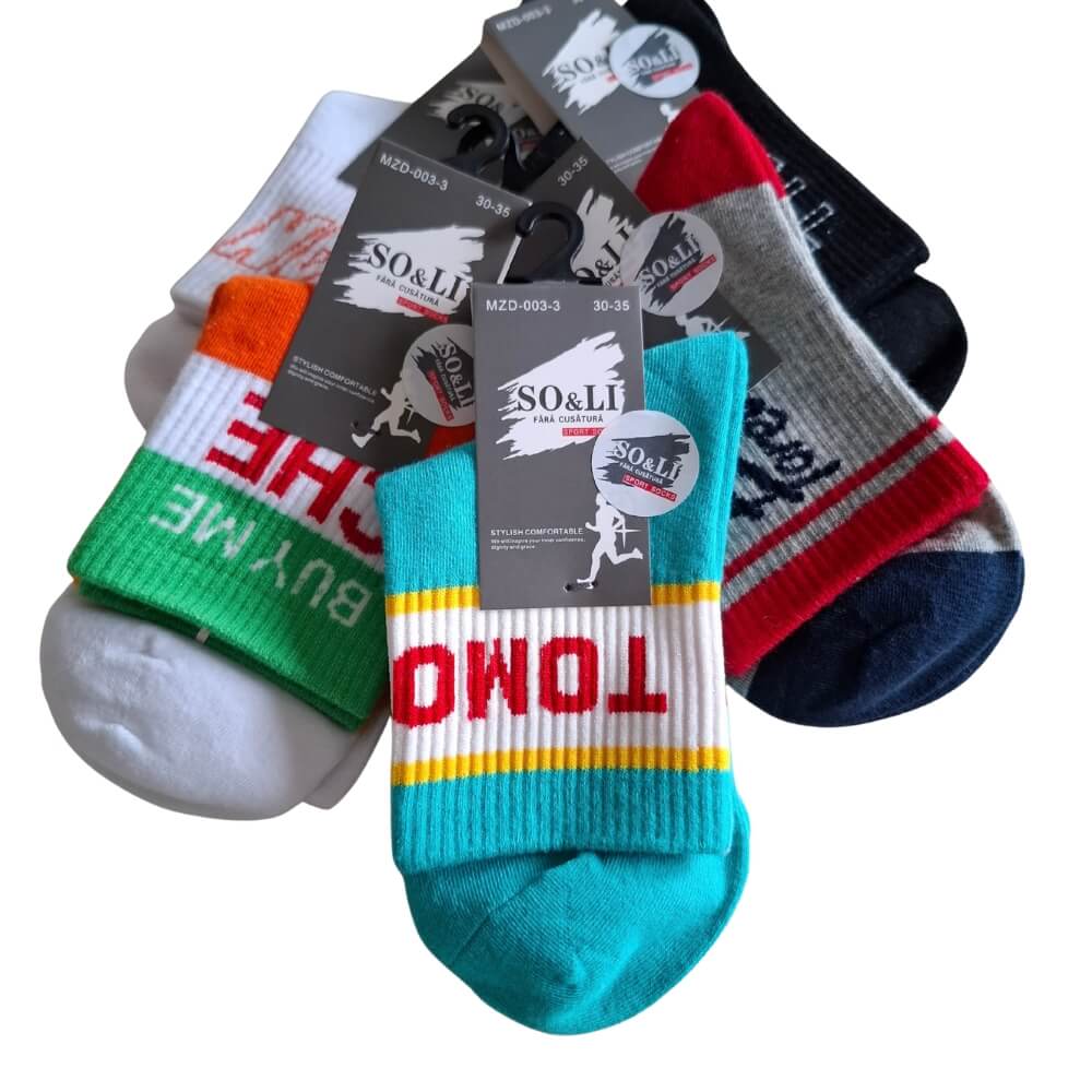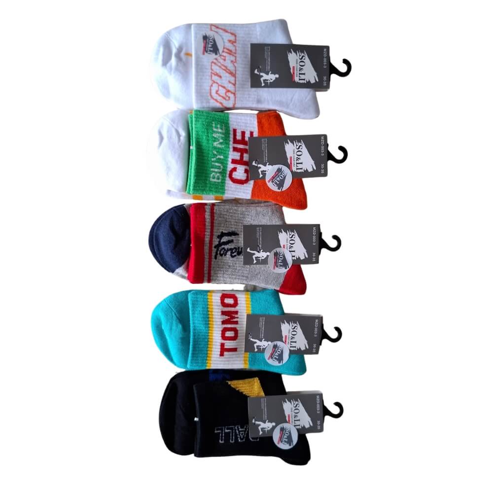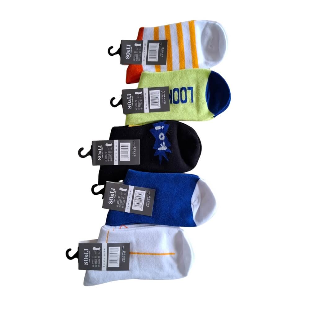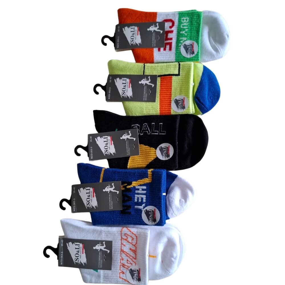 W zestawie znajduje się 5 różnych par w sportowym, młodzieżowym stylu. Każdy komplet to mix kolorów i wzorów – zestawy dobierane są losowo z aktualnie dostępnych modeli. W jednym 5-paku każda para jest inna, co nadaje całości dynamiczny charakter.