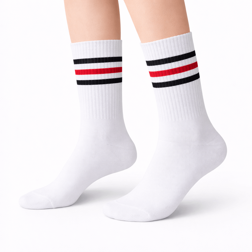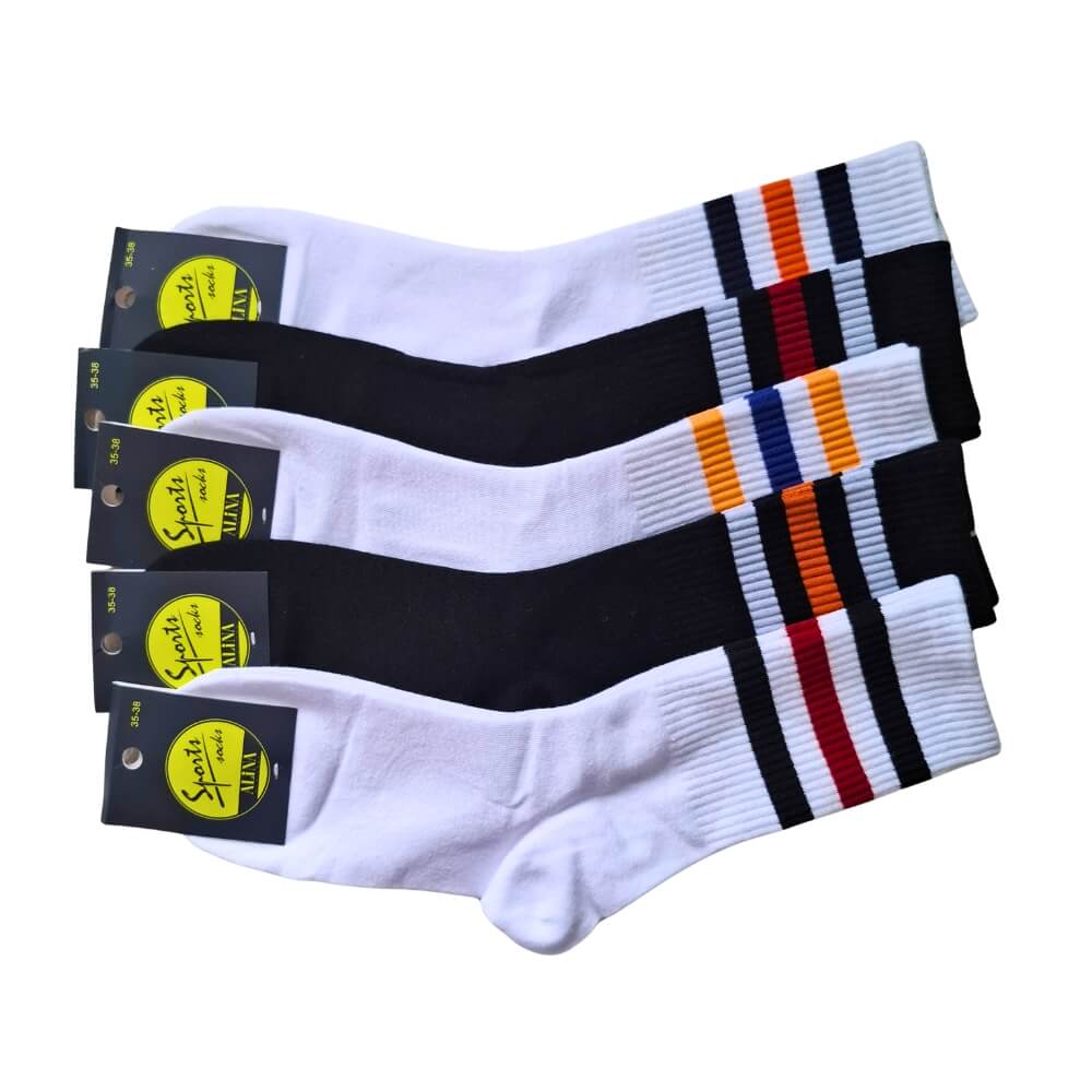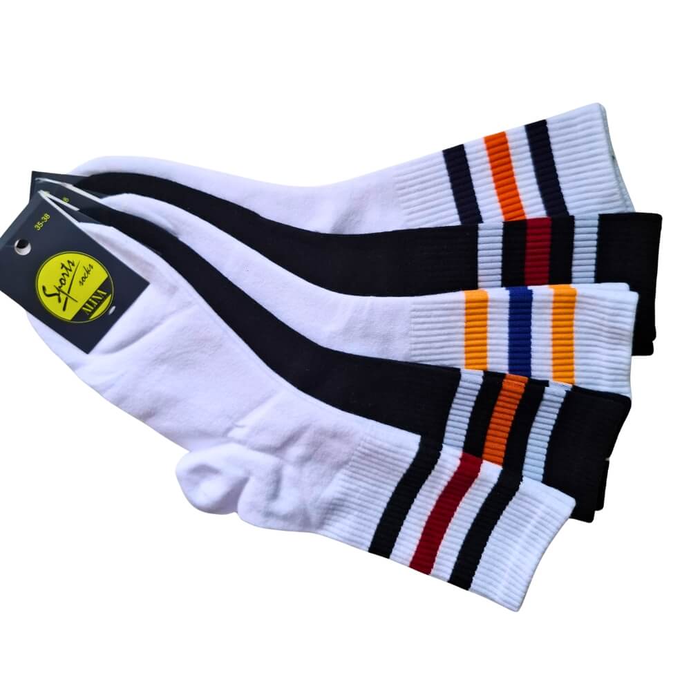 Biała lub czarna baza z kontrastowymi paskami nadaje skarpetkom uniwersalnego, sportowego charakteru. Doskonale komponują się z obuwiem sportowym, sneakersami oraz casualowymi stylizacjami.
